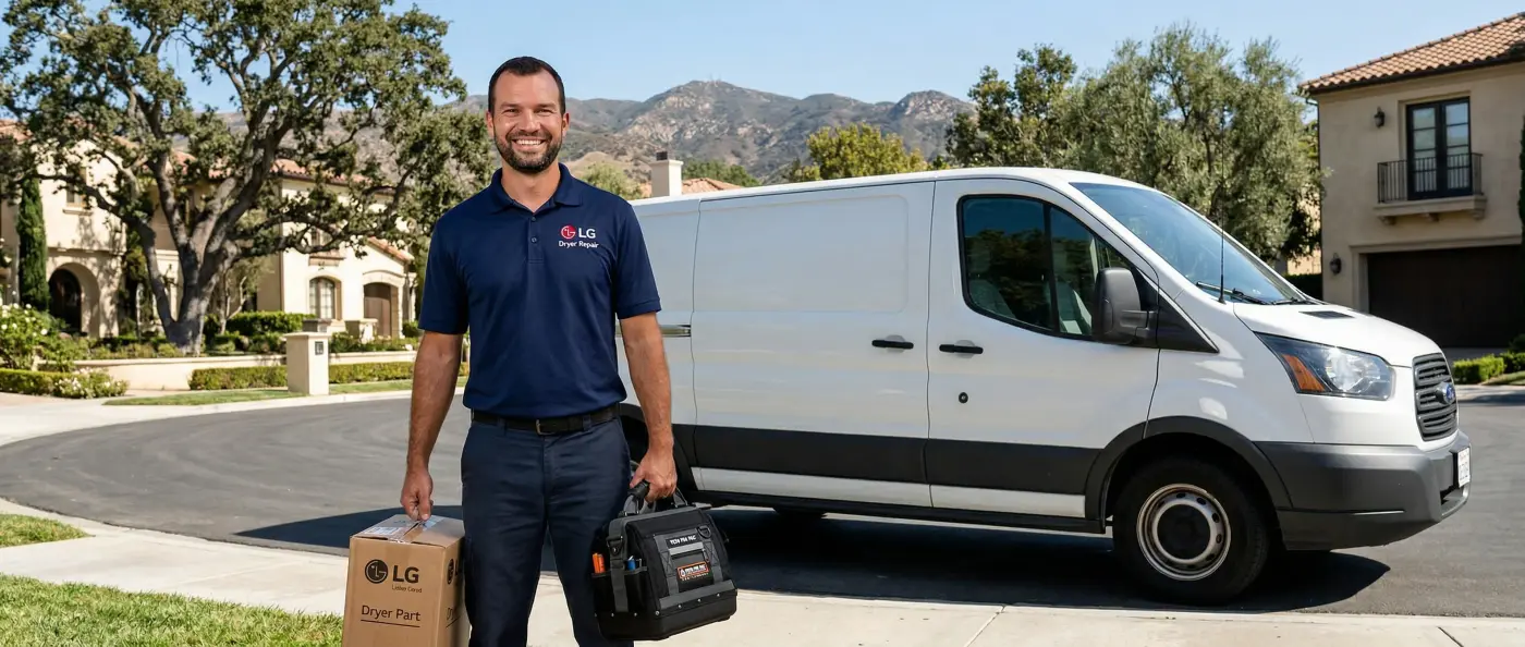 Same pricing as all of LA County — no Calabasas premium. Most repairs $280–380. Premium model mechanical repairs (drum bearing, motor) run $320–480. The $65 diagnostic fee is waived when you approve any repair. Full pricing at our LG dryer repair cost page. Every invoice includes a 10% discount code for your next service call — never expires.