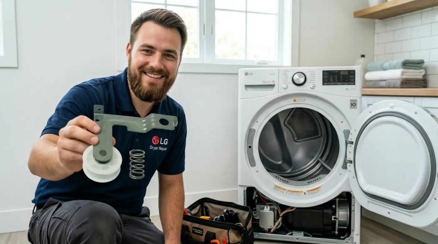 We replace idler pulleys on all LG dryer models — DLGX series, DLEX series, DLE, DLG, and LG Signature. Gas and electric. Pulley specifications vary by model so we confirm the correct part before arrival. Give us your model number when you call and we'll have what we need on the truck.