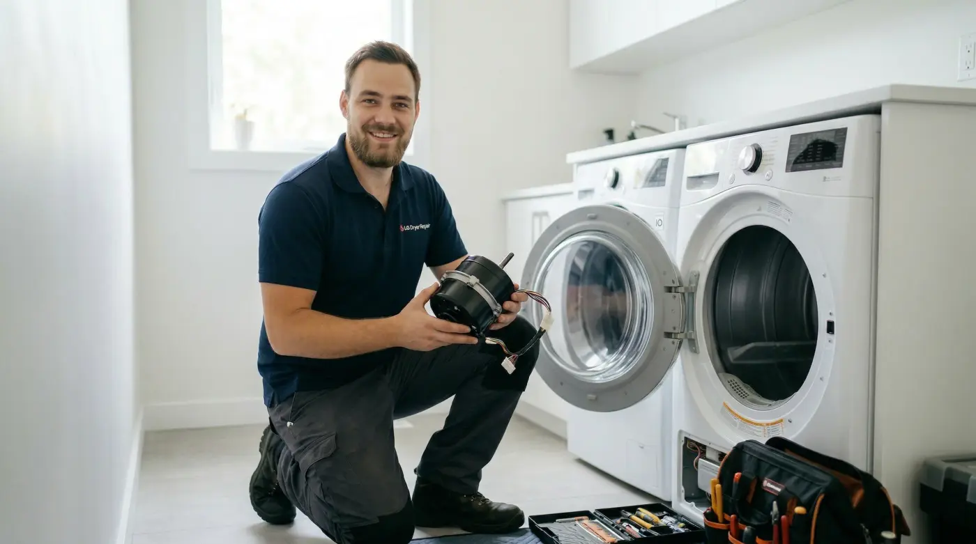 We replace drive motors on all LG dryer models — DLGX series, DLEX series, DLE, DLG, and LG Signature. Both gas and electric. We stock motor assemblies for the most common DLGX, DLEX, and DLE series in our vans. Less common models may require next-day parts — we'll confirm availability when you call with your model number so we're not making a second trip.